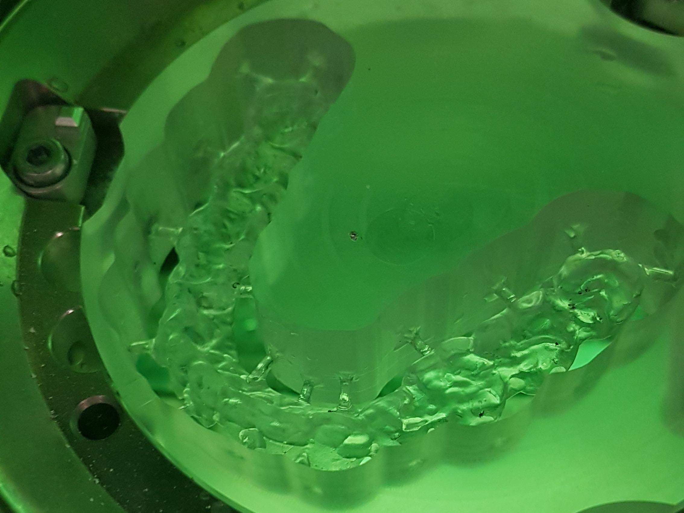 Sind wir nun ästhetisch und funktional mit dem konstruierten Zahnersatz zufrieden, exportieren wir den Datensatz und beginnen mit der Fertigung (CAM). Beim CAM gibt es sowohl additive wie subtraktive Herstellungsverfahren. Wir nutzen beispielsweise für die Herstellung individueller Löffel den 3D-Druck, der zu den additiven Verfahren zählt. Für das Fertigen von Zahnersatz greifen wir auf die Frästechnik zurück, die ein subtraktives Herstellungsverfahren darstellt. Dabei benutzen wir Blöcke und Ronden unterschiedlichster Materialien wie Keramik, Lithium-Disilikat, Kunststoff oder Titan, um den gewünschten Zahnersatz herzustellen. Unsere Fräsmaschine bearbeitet nun auf Grundlage der zuvor erstellten digitalen Konstruktion das Material bis zur Fertigstellung.
